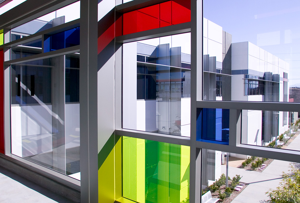 Using similar organizational patterns while changing materials, colors, and scale, a bold, unique style was achieved. These patterns are expressed in the site’s organization, walkways, building footprints, bridges, elevations, interior wall detailing, interior finish floor materials and project signage.
